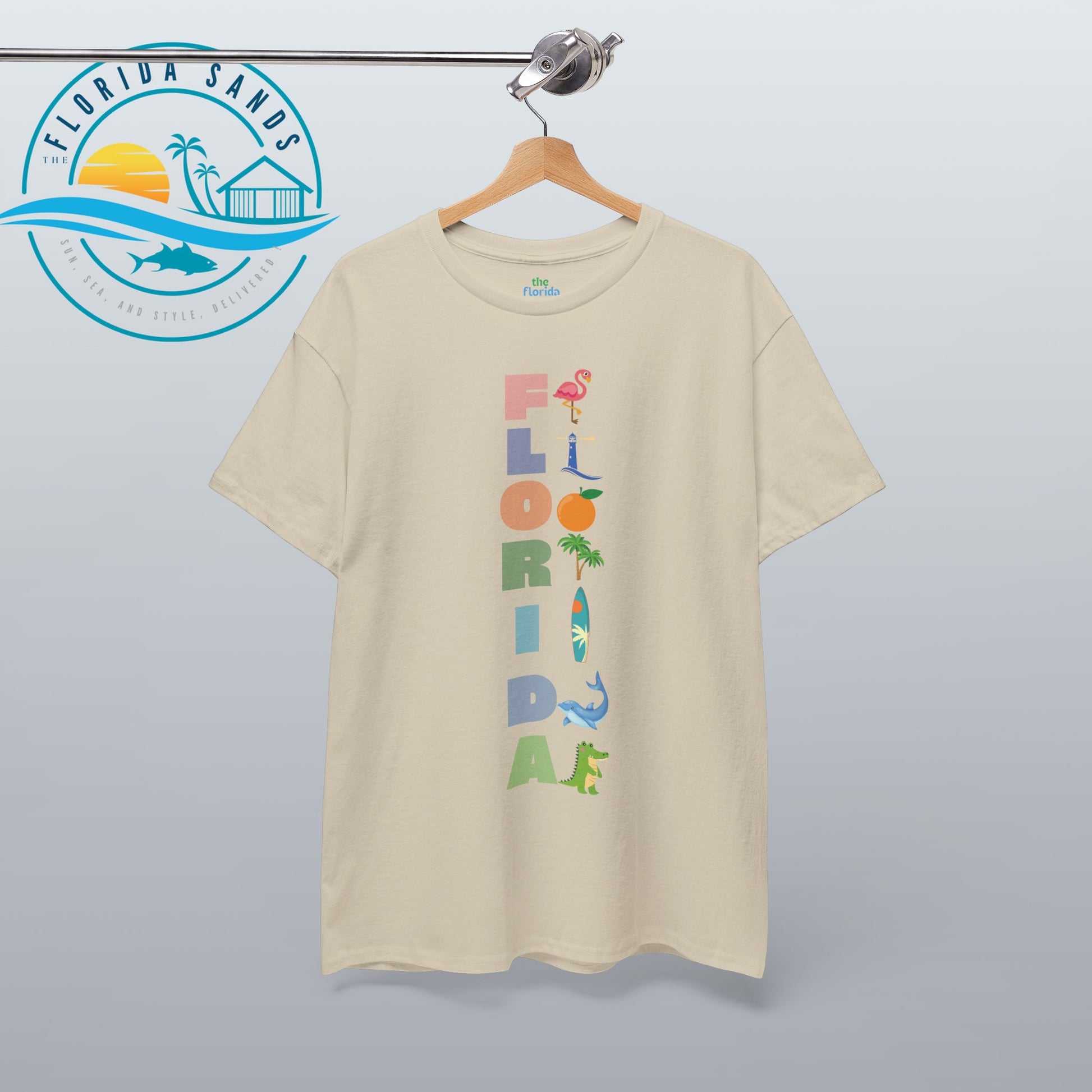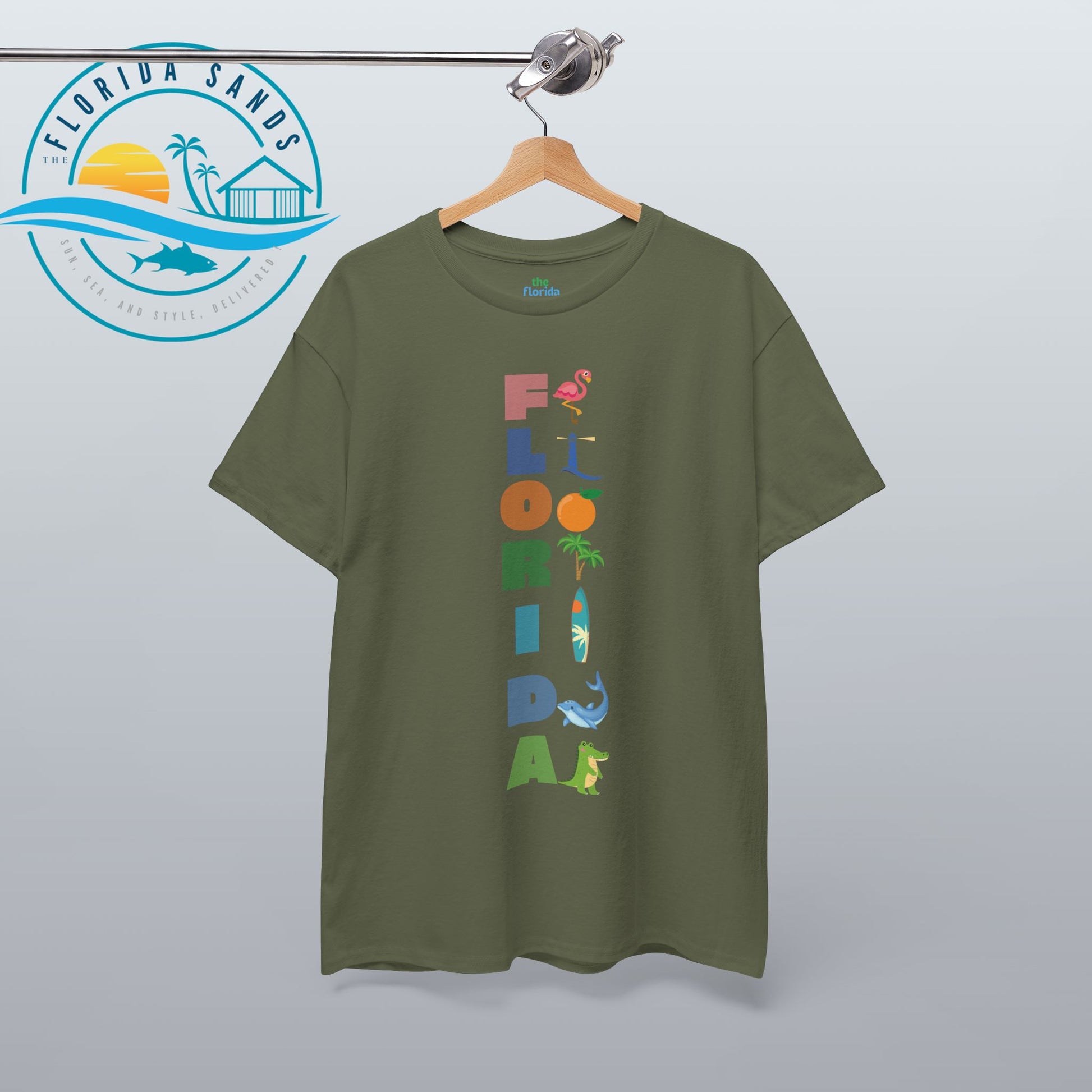 Show off your love for the Sunshine State with our “FLORIDA” T-shirt, featuring a creative vertical design where each letter is paired with an iconic Florida image. From F for Flamingo, L for Lighthouse, O for Orange, R for Palm Tree, I for Surfboard, D for Dolphin, to A for Alligator, this tee captures the essence of Florida in a fun and artistic way. Made from soft, breathable cotton, it’s perfect for beach days, casual outings, or simply celebrating the sights and spirit of Florida. Comfortable, colorful, and full of personality, this unisex tee is a must-have for anyone who wants to carry a piece of Florida wherever they go.