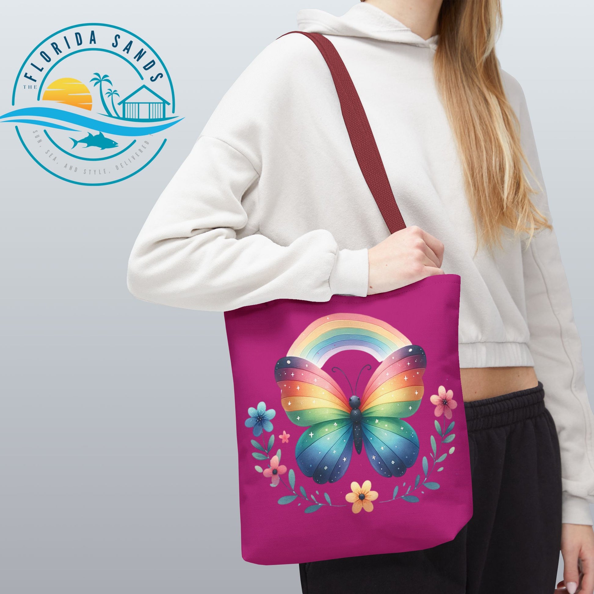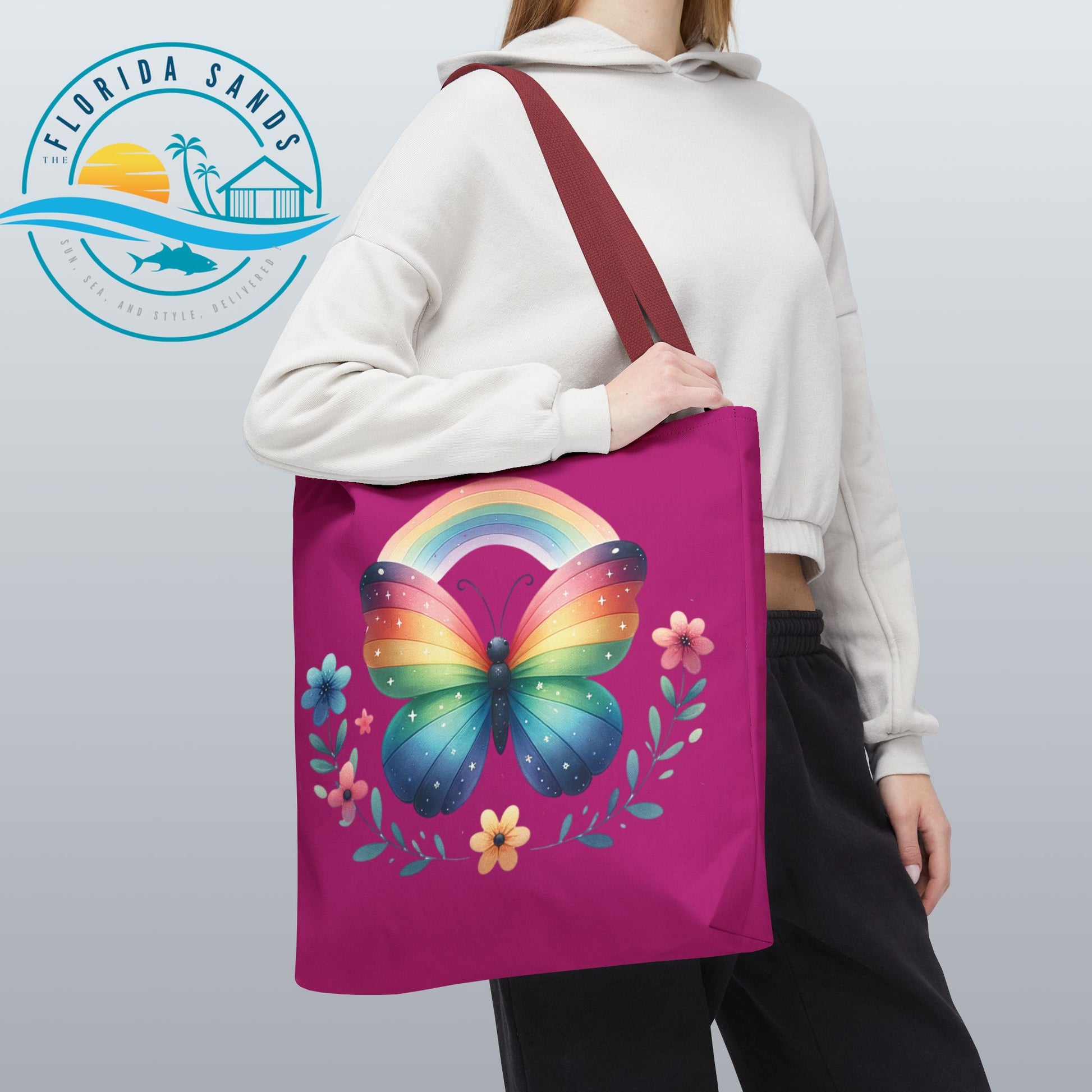 Let your style take flight with this vibrant tote featuring a beautiful rainbow-colored butterfly surrounded by blooming flowers. Bursting with color and positive energy, this bag captures the spirit of sunshine, freedom, and the Florida vibe.