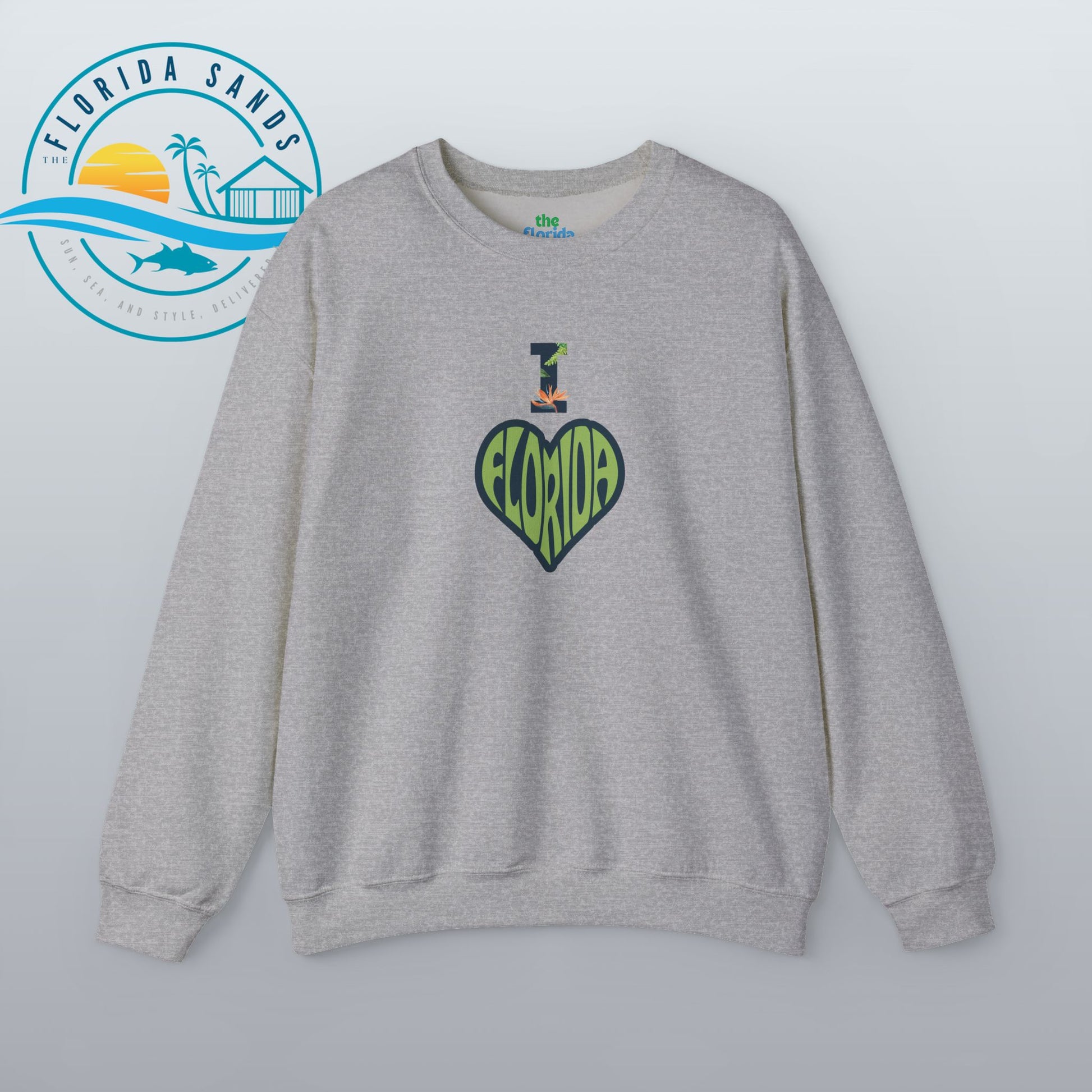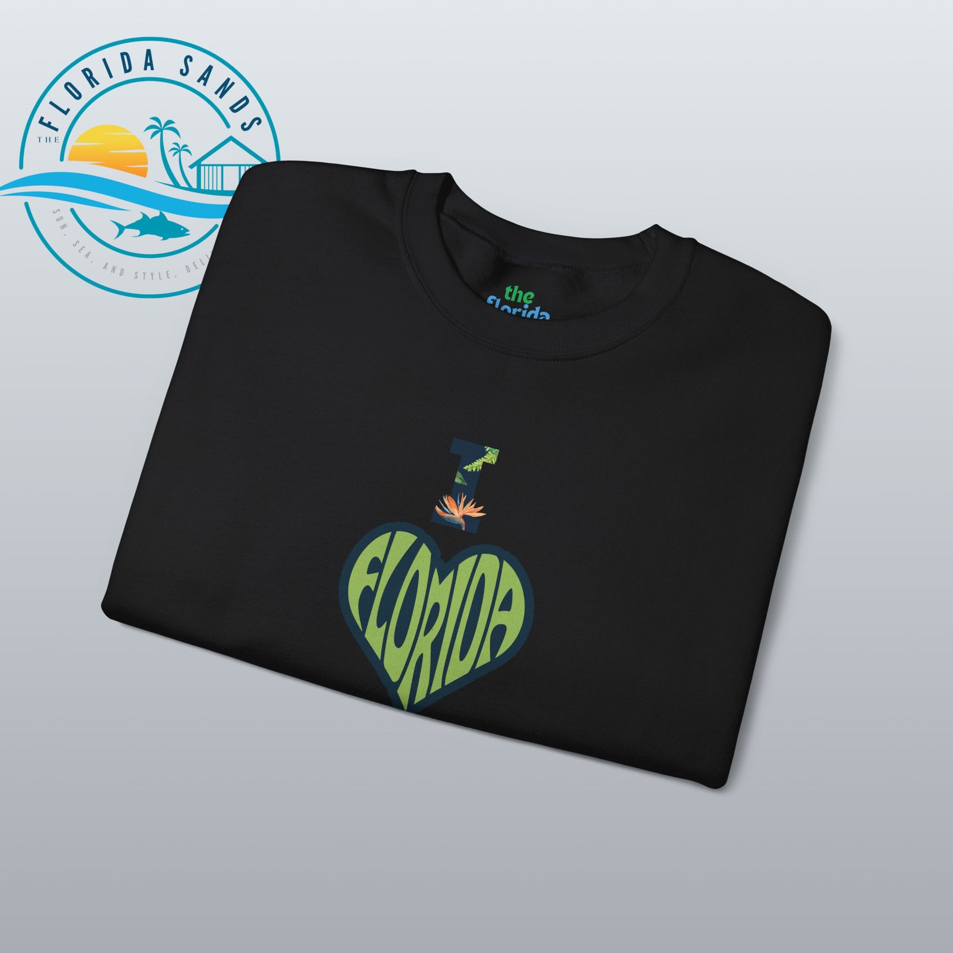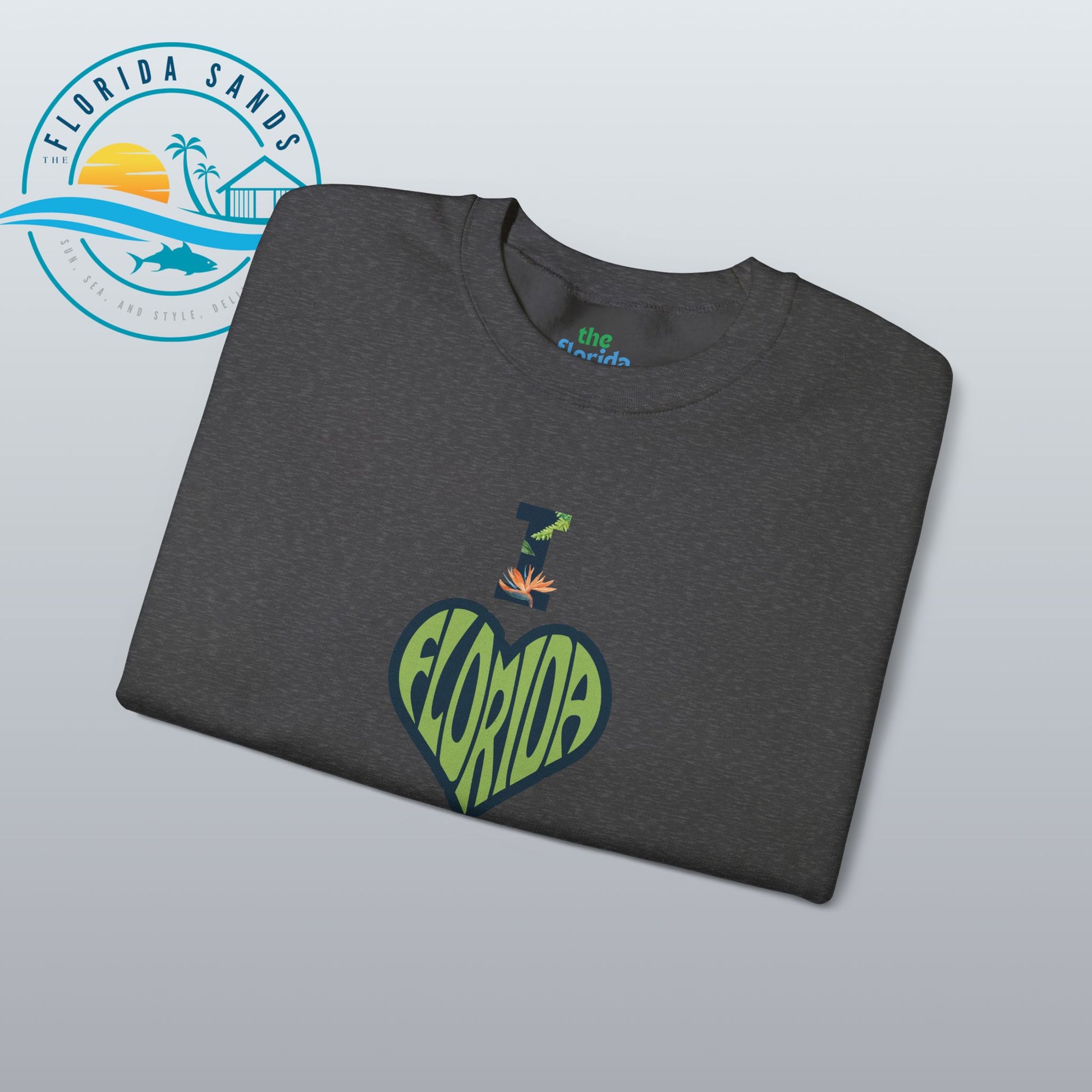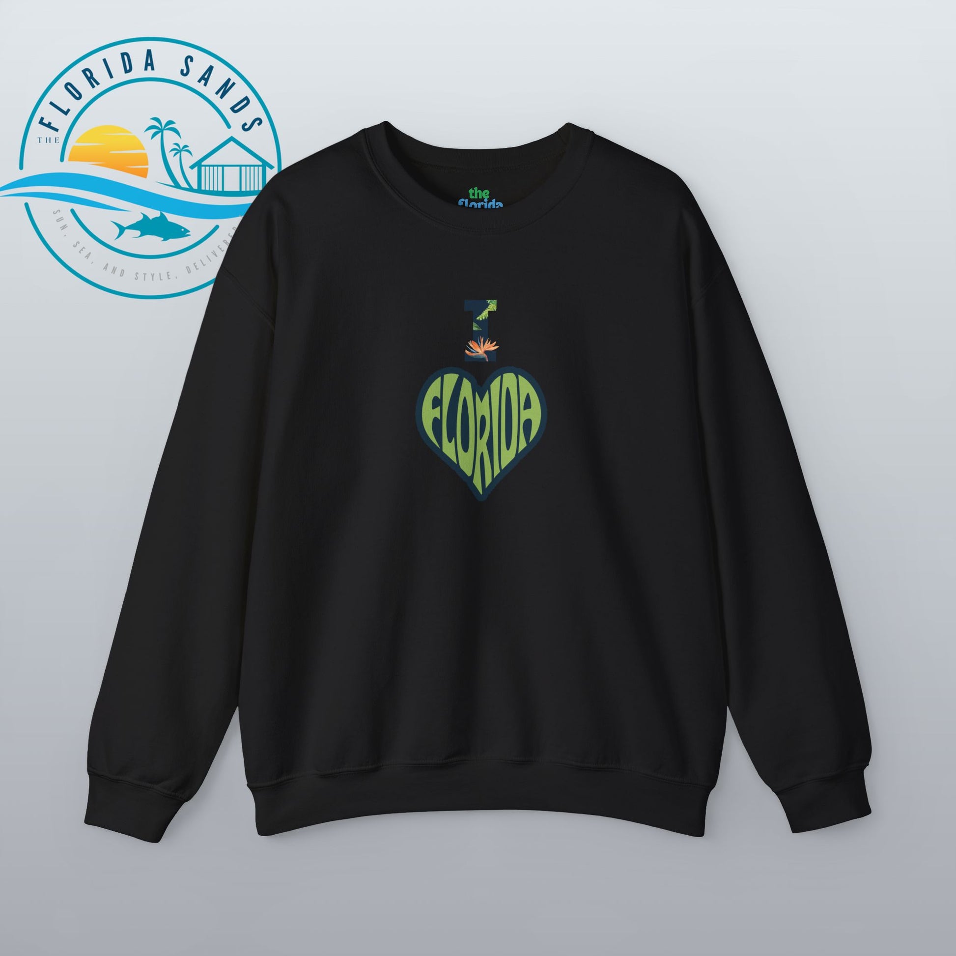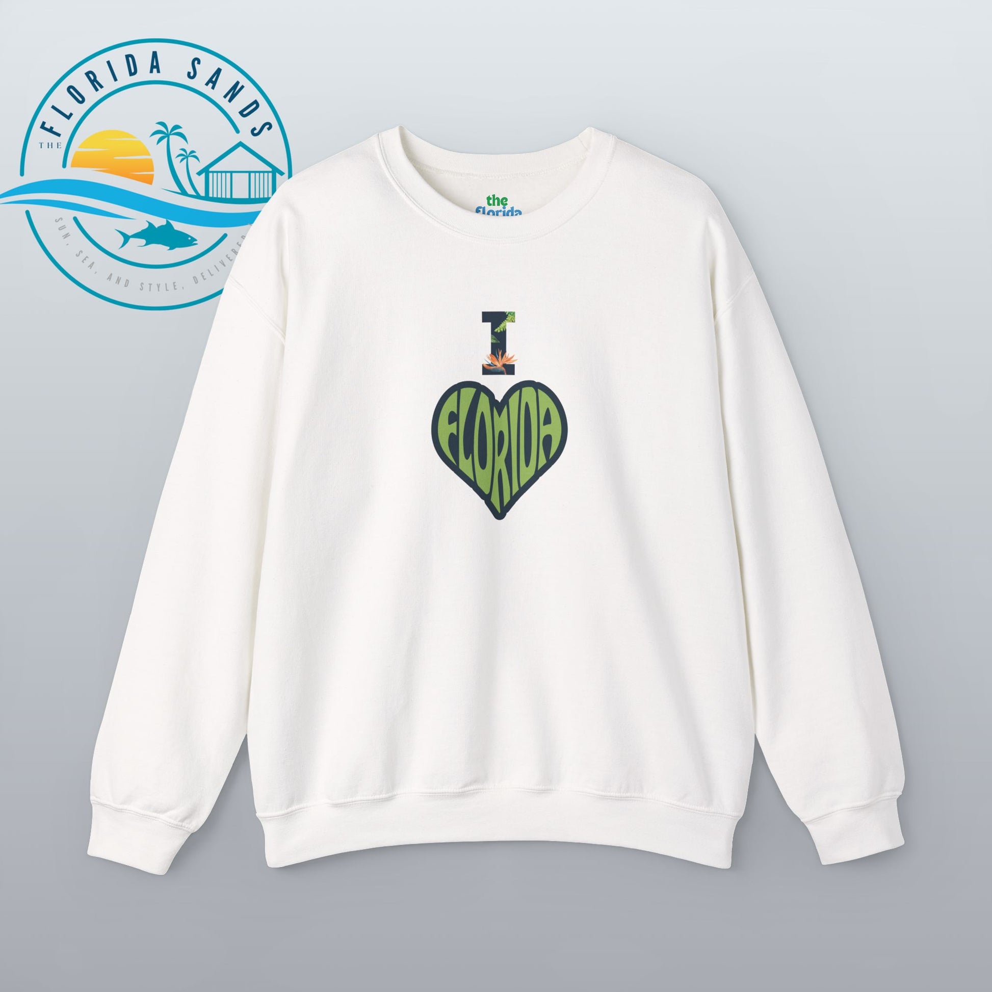 Celebrate your love for the Sunshine State with our “I Love Florida” sweatshirt from The Florida Sands! Featuring a creative heart-shaped design where the letters FLORIDA are seamlessly blended into the heart, and a tropical-styled “I” above it, this design perfectly captures the spirit, warmth, and vibrant energy of Florida living.