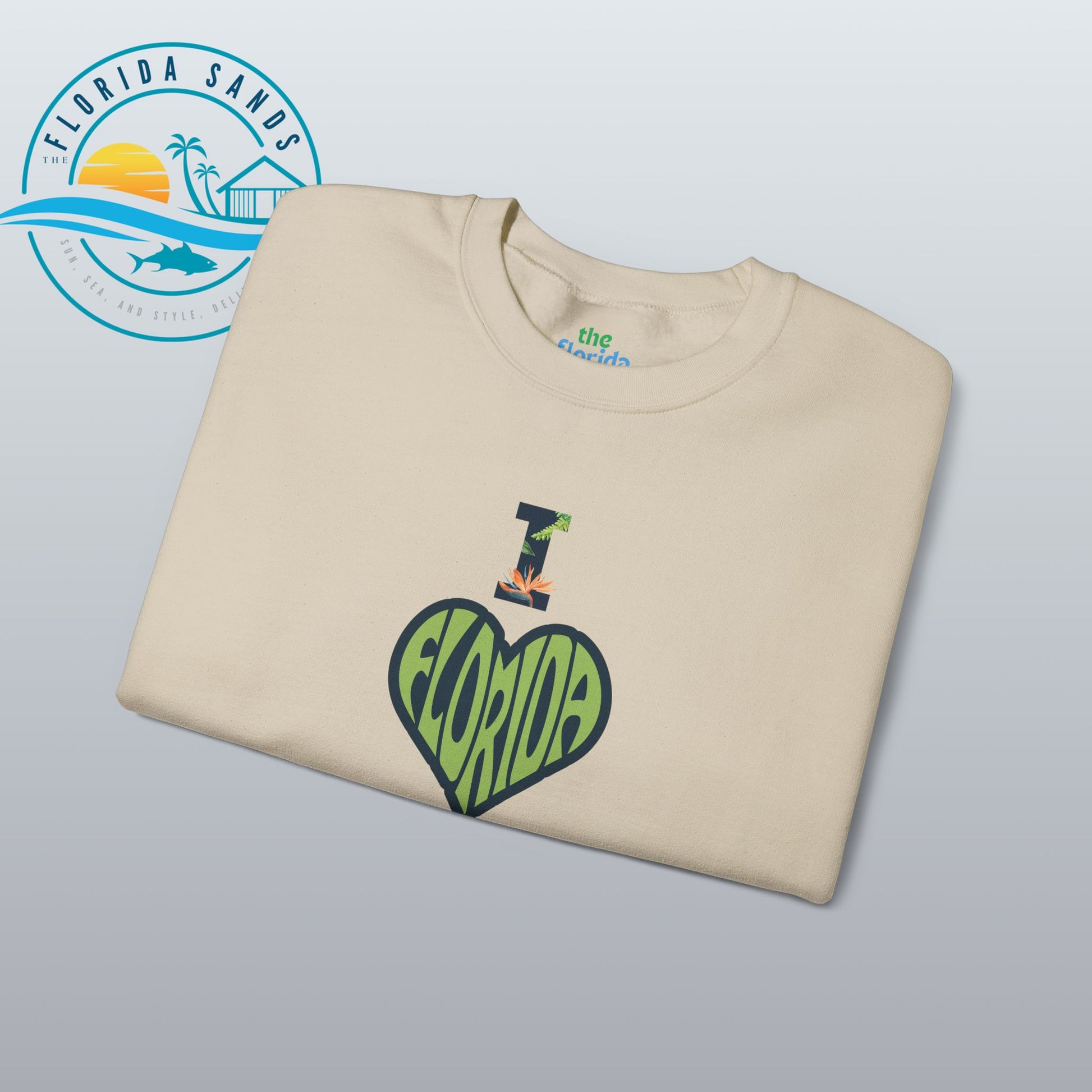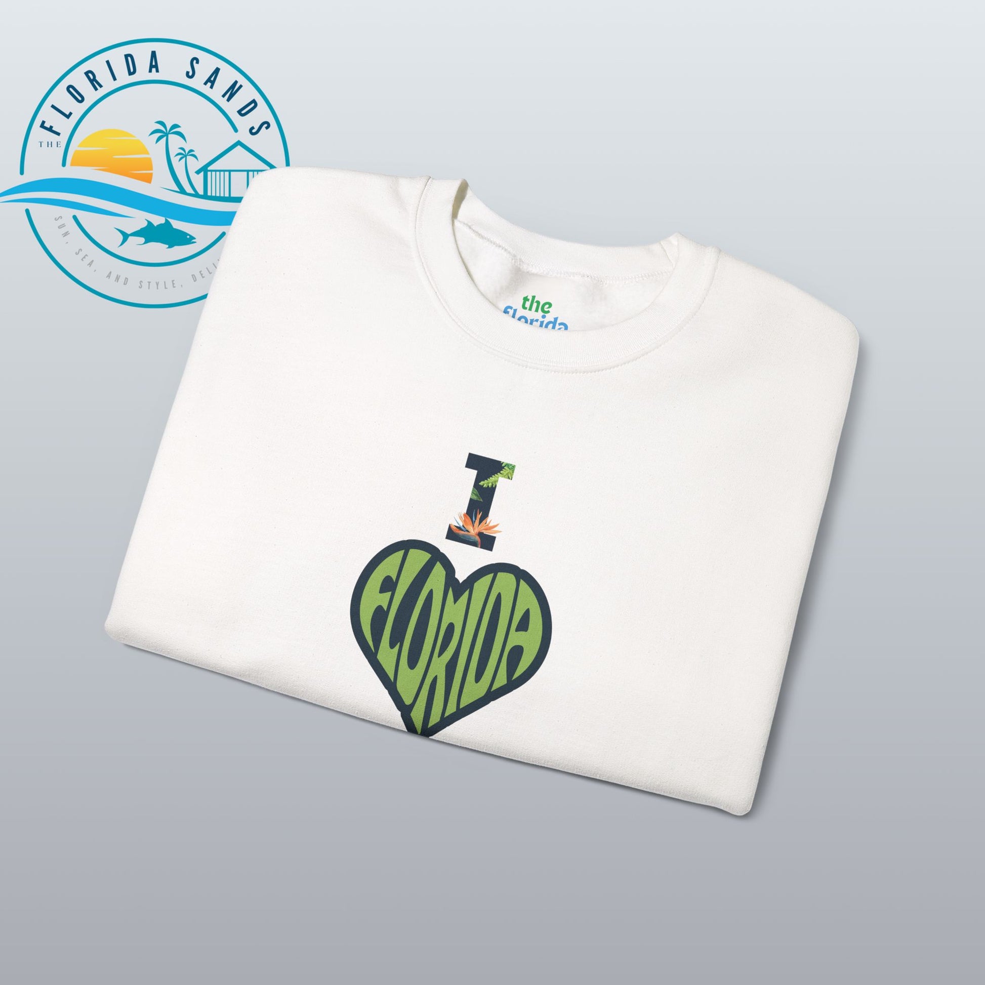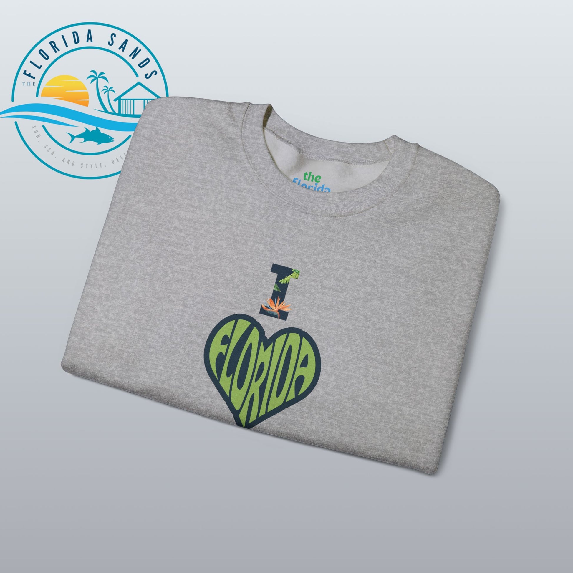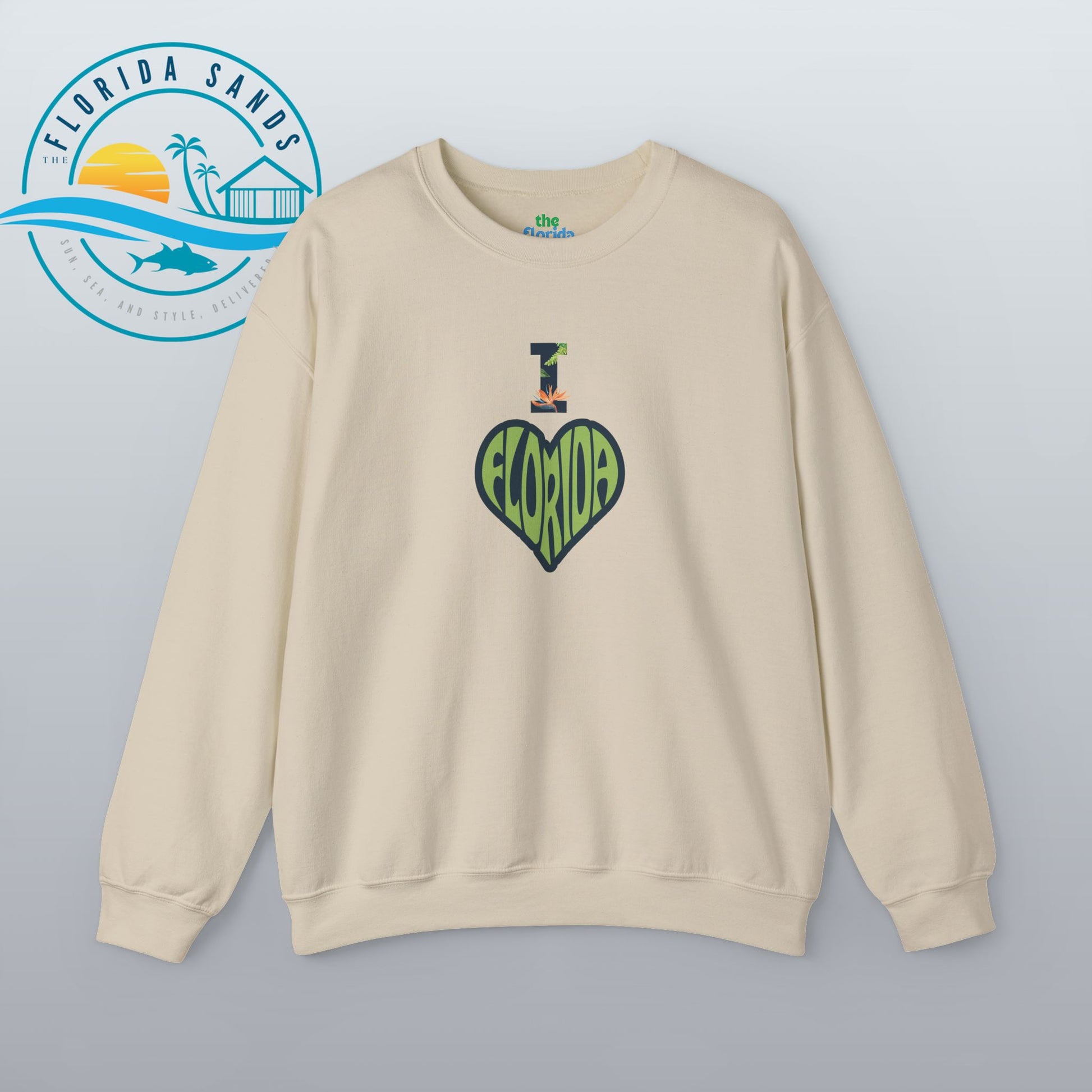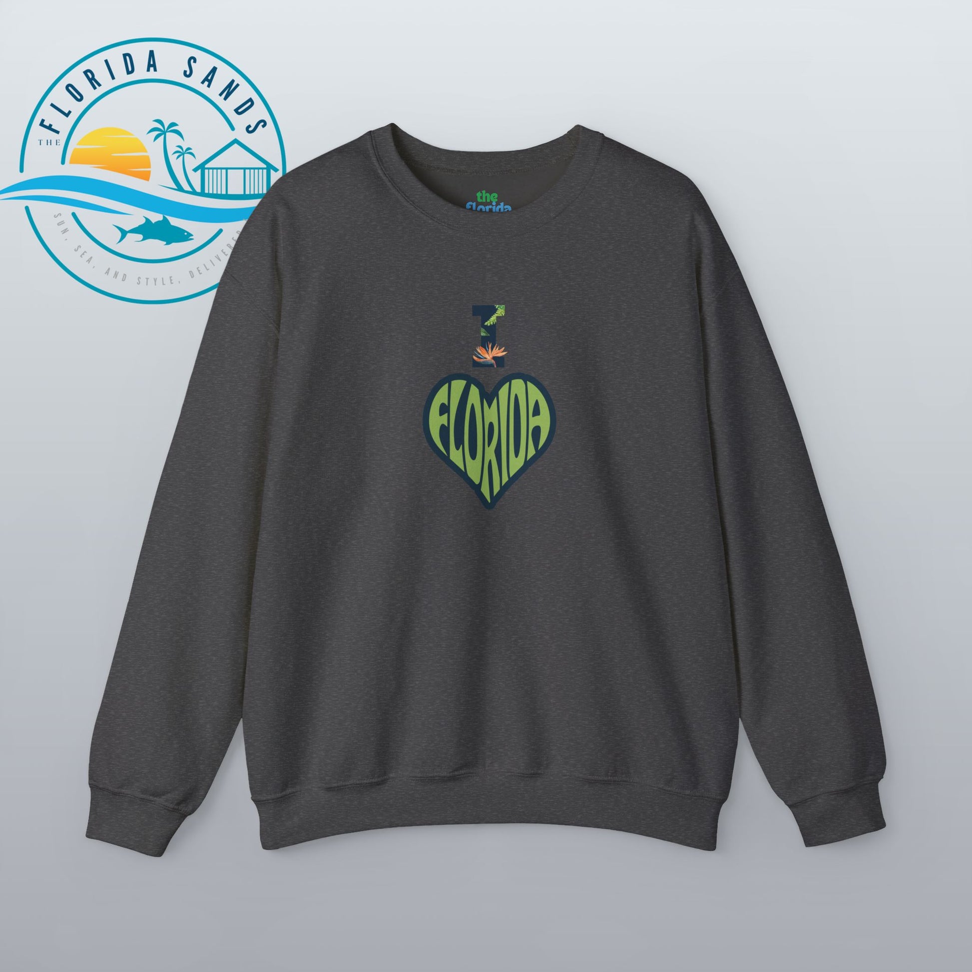 Celebrate your love for the Sunshine State with our “I Love Florida” sweatshirt from The Florida Sands! Featuring a creative heart-shaped design where the letters FLORIDA are seamlessly blended into the heart, and a tropical-styled “I” above it, this design perfectly captures the spirit, warmth, and vibrant energy of Florida living.
