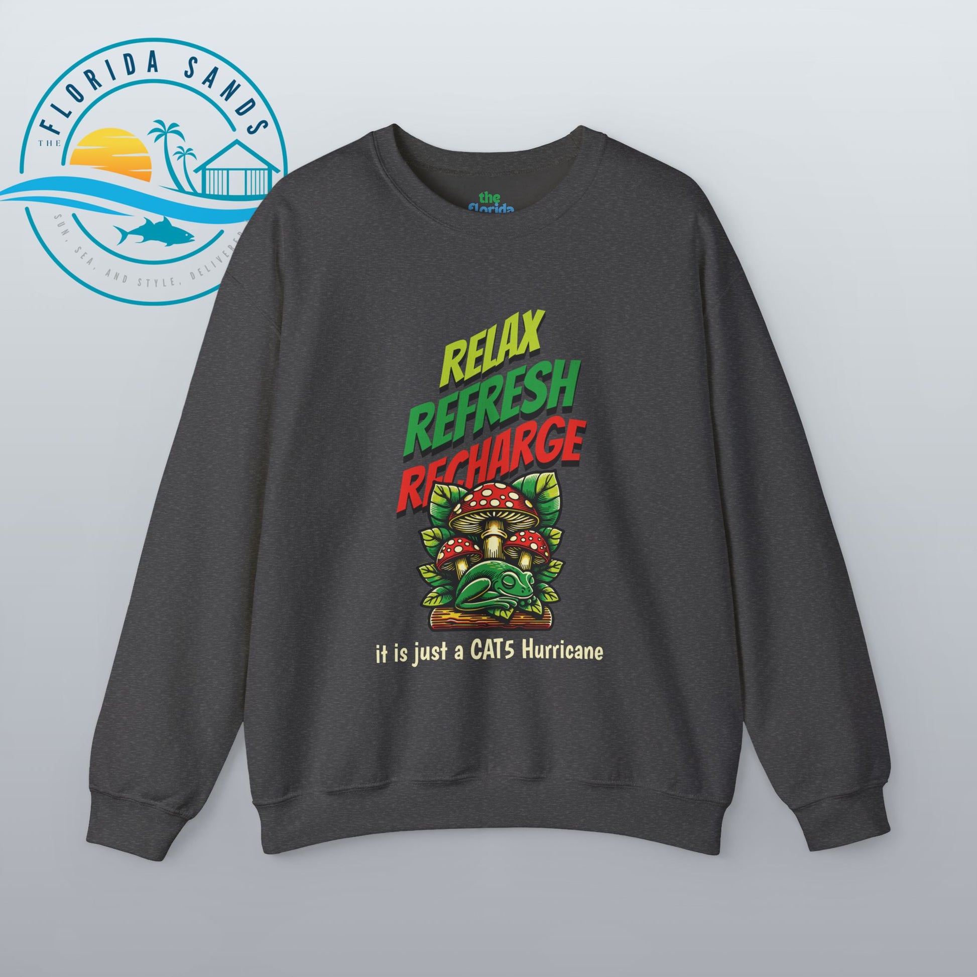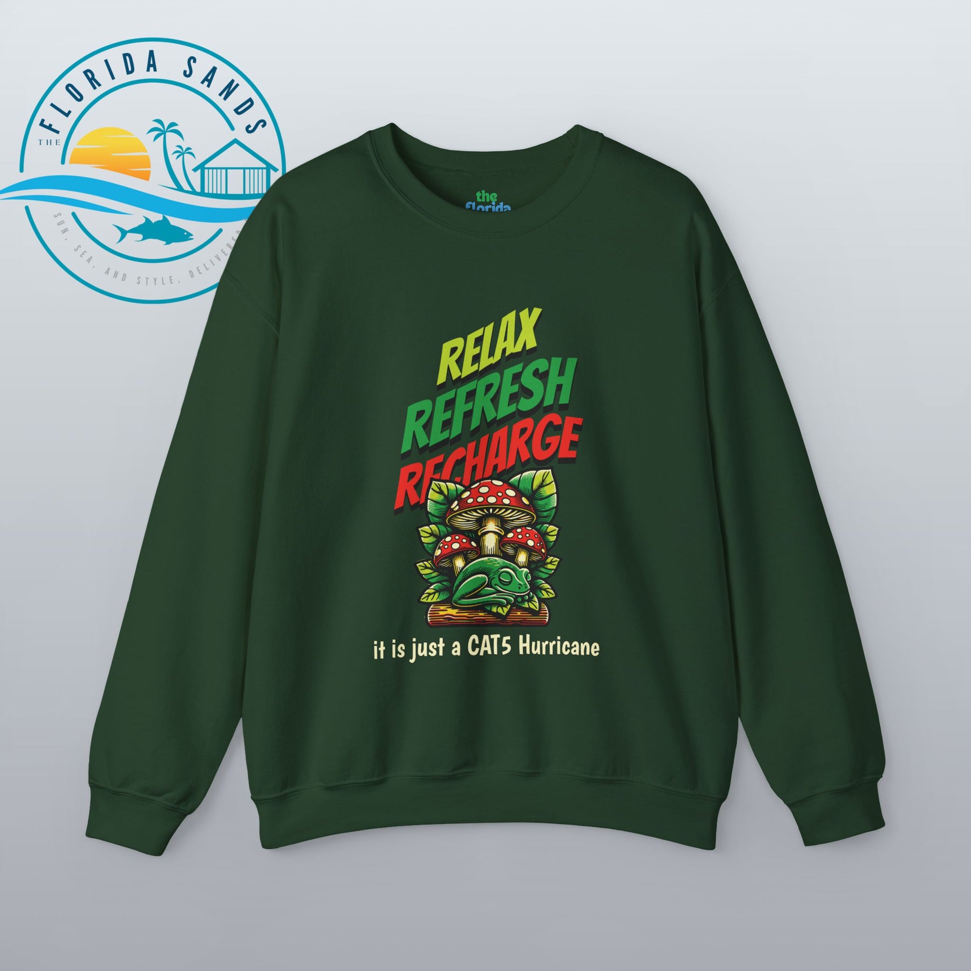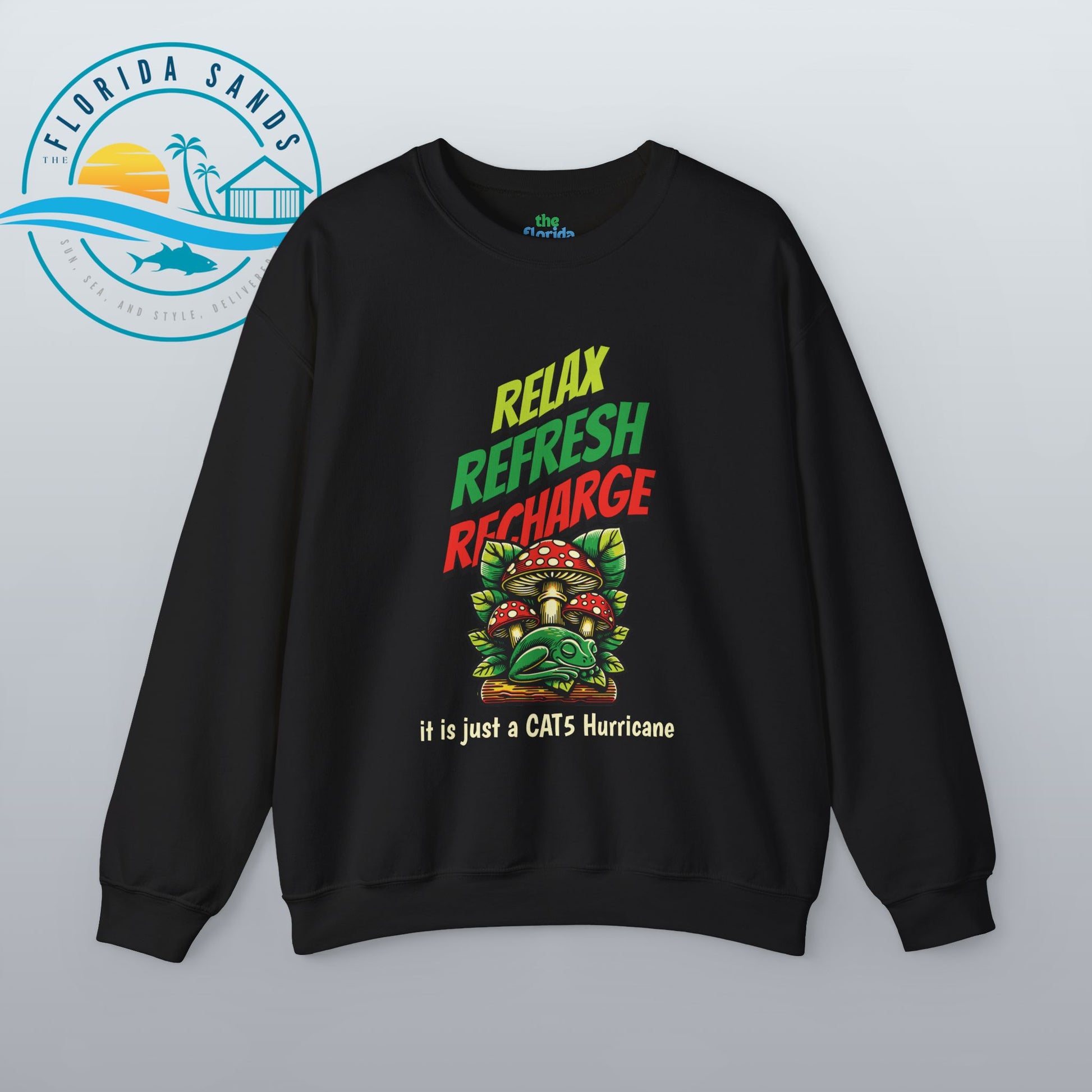 tay calm through any storm with our “Relax, Refresh, Recharge – It’s Just a Cat5 Hurricane” Sweatshirt, a witty and whimsical take on Florida’s legendary storm-season spirit. Featuring a laid-back frog chilling under a mushroom, this design perfectly captures that unique Florida attitude — relaxed, humorous, and totally unbothered, even when the winds start to howl.