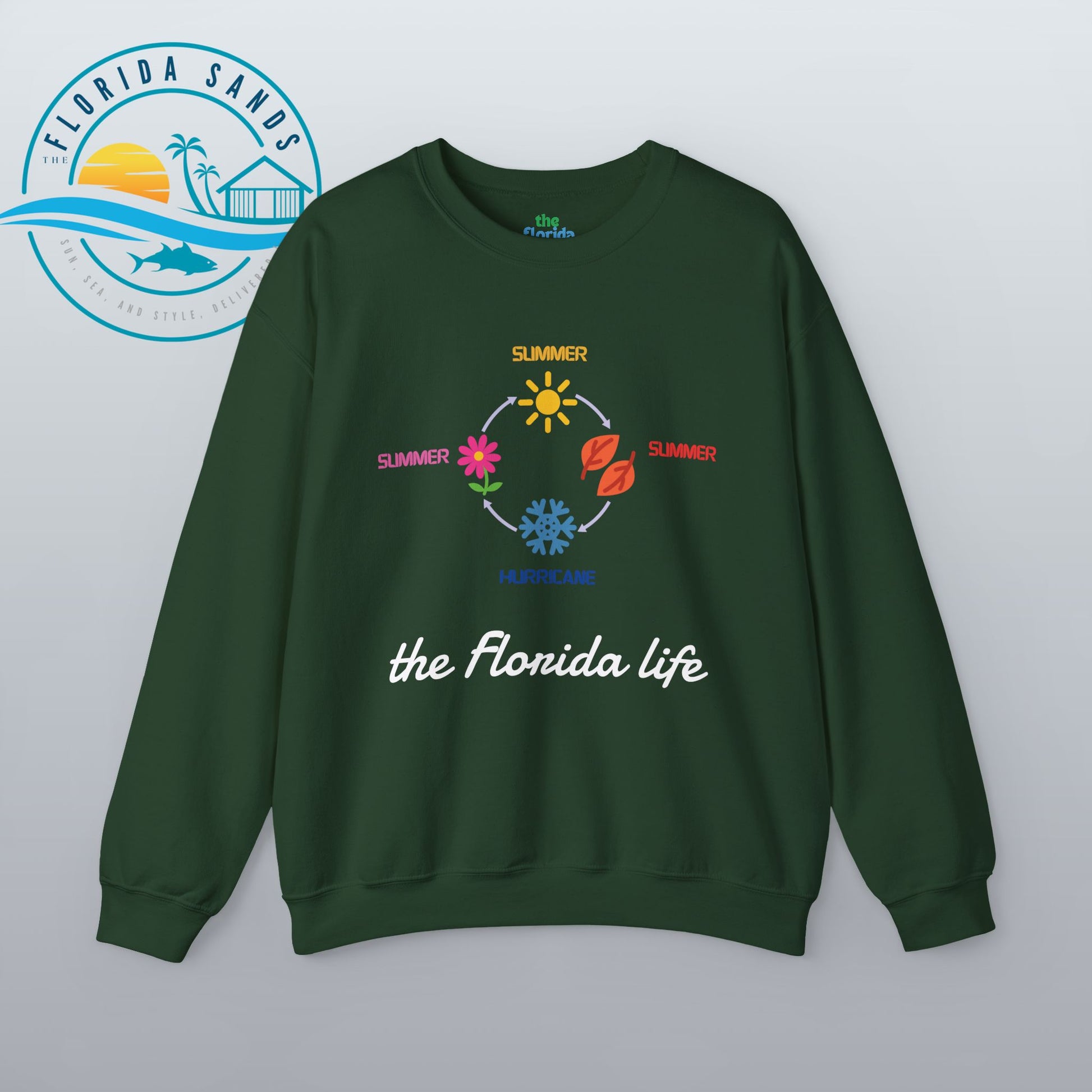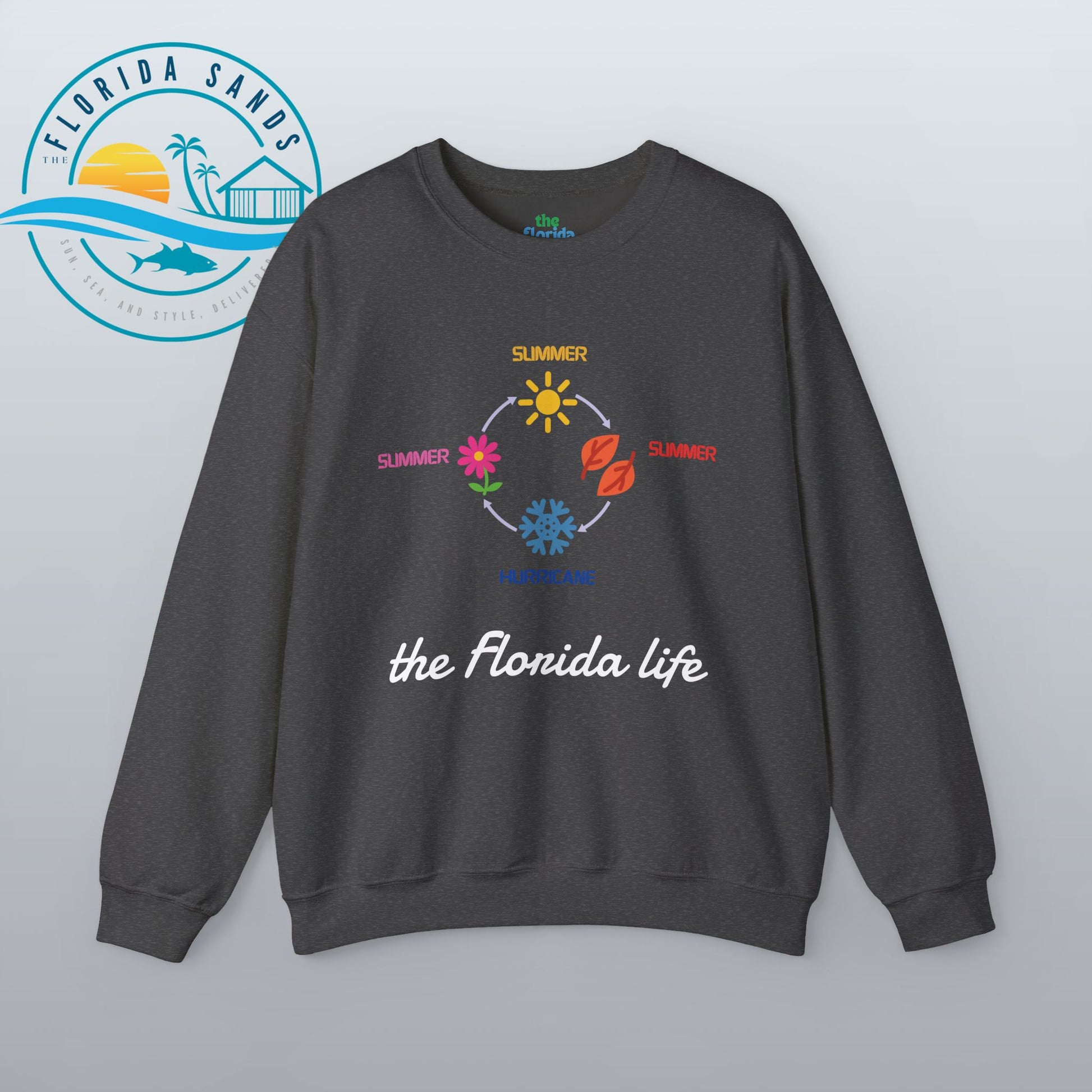 Embrace the true essence of the Sunshine State with our “The Florida Life” sweatshirt from The Florida Sands! Featuring a playful and eye-catching design that captures Florida’s four “seasons” — summer, summer, summer, and hurricane — this graphic perfectly showcases the state’s endless summer vibe with a touch of humor.